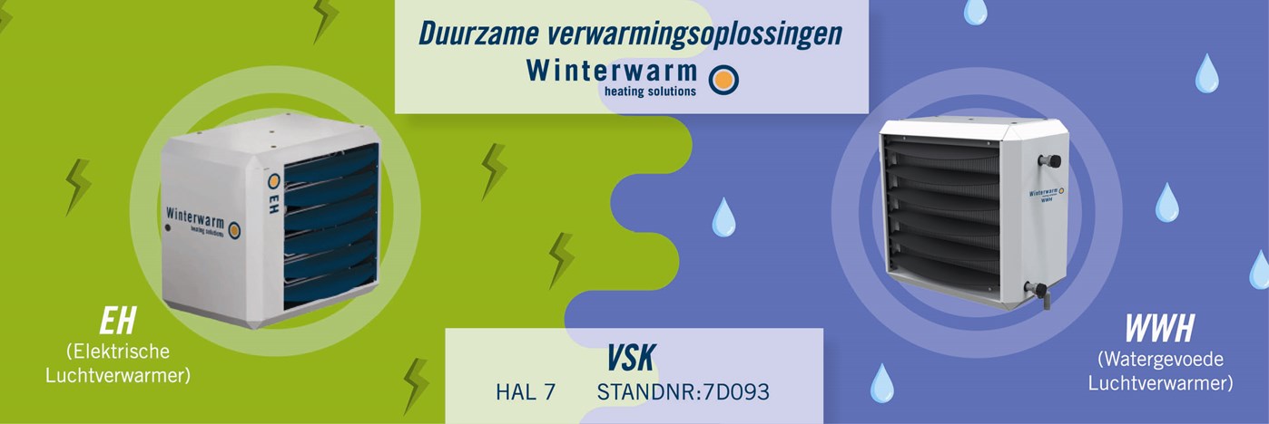 Van 17 t/m 20 mei is Winterwarm samen met zusterbedrijf WinLed Lighting Solutions aanwezig op de VSK beurs in Utrecht. Met alle ogen gericht op een duurzame toekomst, biedt Winterwarm ook duurzame verwarmingsoplossingen. Zo presenteren wij op de VSK beurs de EH (Elektrische luchtverwarmer) en de redesign van de WWH (Watergevoede luchtverwarmer). De elektrische luchtverwarmer is beschikbaar van 5 tot 40 kW waarvan de kleinste twee types ook op 230 V. kunnen worden aangesloten. Dit biedt voor veel kleine ruimtes (winkels, kantines, magazijn, etc.) een mooie verwarmingsoplossing. De watergevoede luchtverwarmer heeft een nieuwe look gekregen wat beter past bij de andere producten van Winterwarm. Overigens heeft de watergevoede luchtverwarmer varianten speciaal voor lage watertemperaturen en mét koelingsmogelijkheid. Wij zijn te vinden in hal 7 bij standnummer: 7D093