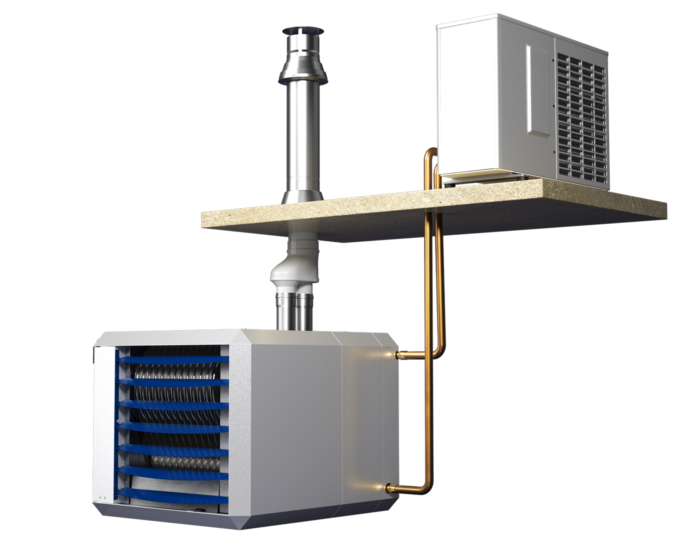 De Qwikshift QSG is een hybride luchtverwarmer bestaande uit een warmtepomp, een gasgestookte booster en een slimme regeling.